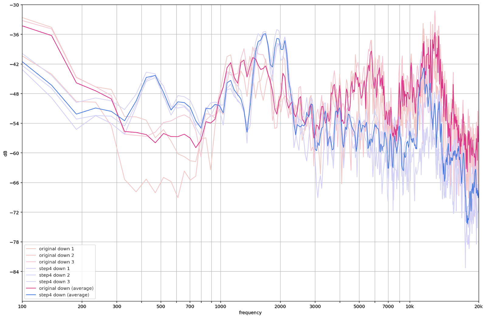 What I find interesting is that with the original stabilizers, the up stroke was far, far quieter above 2kHz than the downstroke. After the modifications, they track fairly closely.